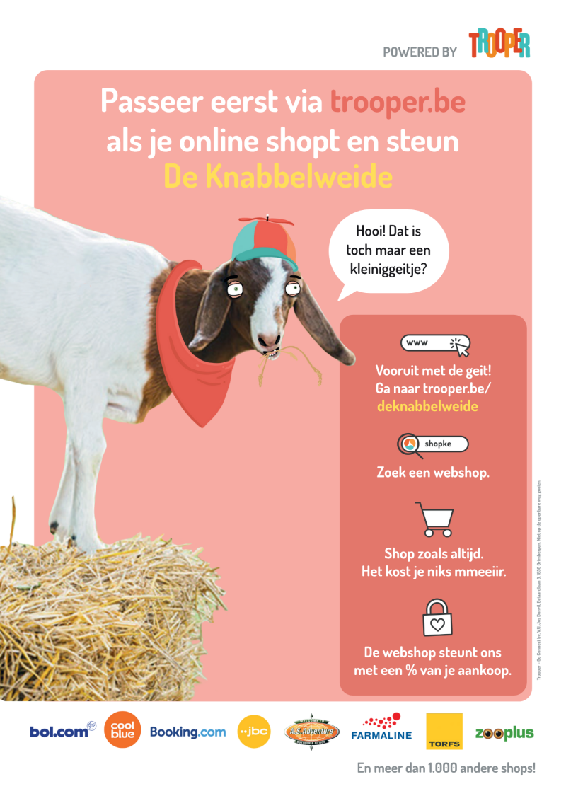 Saviez-vous que vous pouvez soutenir De Knabbelweide en faisant vos achats en ligne, sans que cela ne vous coûte rien ? Grâce à Trooper, un petit pourcentage de vos achats est reversé directement pour le bien-être de nos animaux.